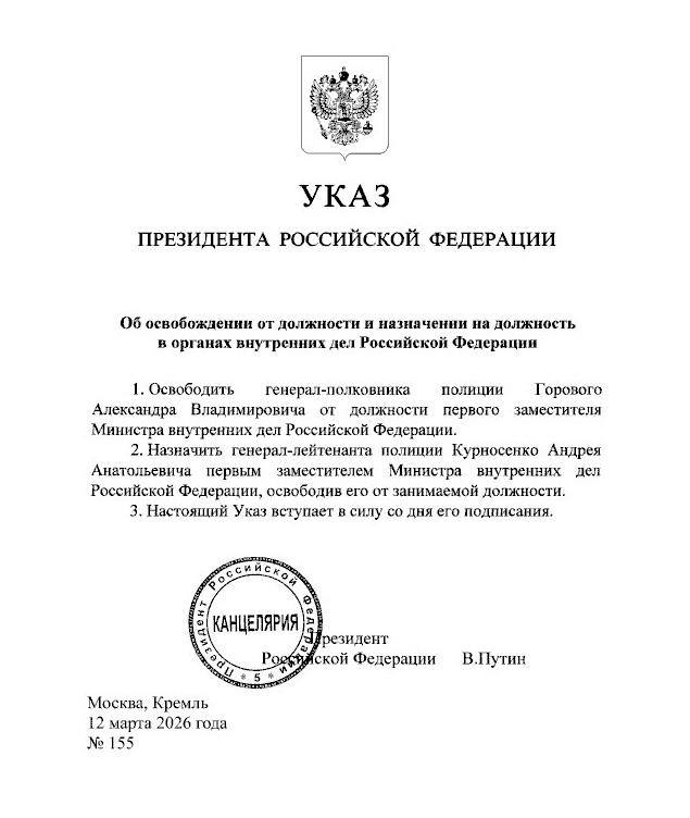 ❗️Первый заместитель Владимира Колокольцева может уйти в отставку, рассказали источники «Ведомостей». Первый замглавы МВД Александр Горовой скоро может оставить свой пост, говорят собеседники «Ведомостей». Он пришел на службу в 1980-е гг., а нынешнюю должность…Путин произвел перестановки в руководстве МВД РФПрезидент РФ освободил Александра Горового от должности первого заместителя министра внутренних дел РФ. На этот пост назначен Андрей Курносенко.